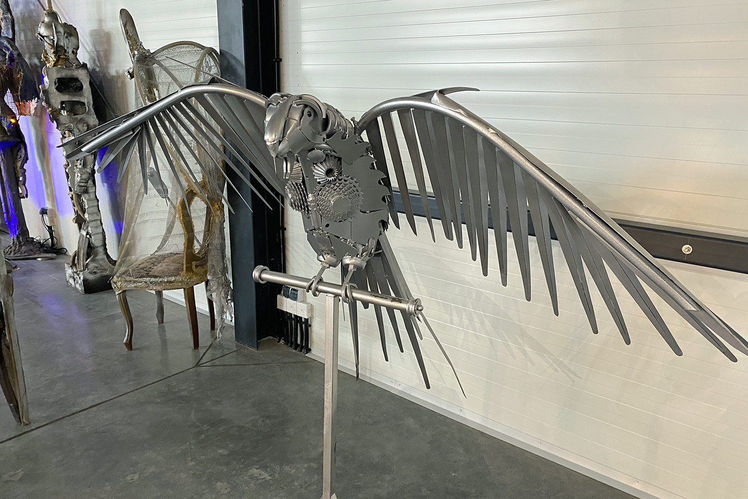 Наша мощная птица, сияющая своим стальным оперением, была «сварена» из ржавых и неприглядных запчастей, которые Сергей Панков, являющийся бакалавром сварочного производства, обновил до неузнаваемости.